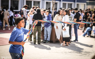 Don Bosco Groot-Bijgaarden koos vorig jaar als jaarthema voor 'Verbondenheid'. "Om dat thema extra in de verf te zetten, hebben we toen een heuse uitdaging voor de leerlingen opgezet. Namelijk het wereldrecord 'langste vriendschapsbandje maken'", vertelt directeur Bert Vermaanen. "Uiteindelijk werden er maar liefst 24.504 vriendschapsbandjes geknoopt, goed voor een grote vriendschapsband van vijf kilometer lang!"